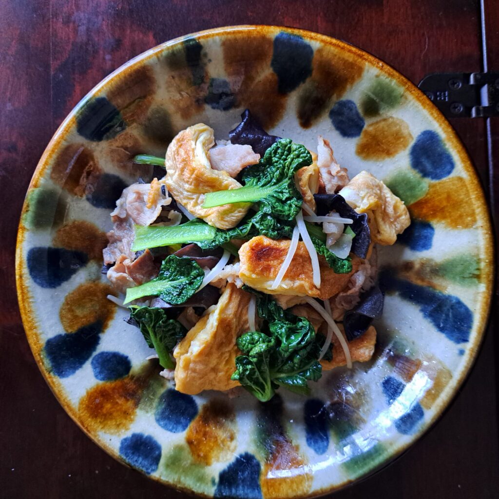 同じフライパンに豚バラ肉を入れ火がとおったら雪菜、もやしを入れて炒める。