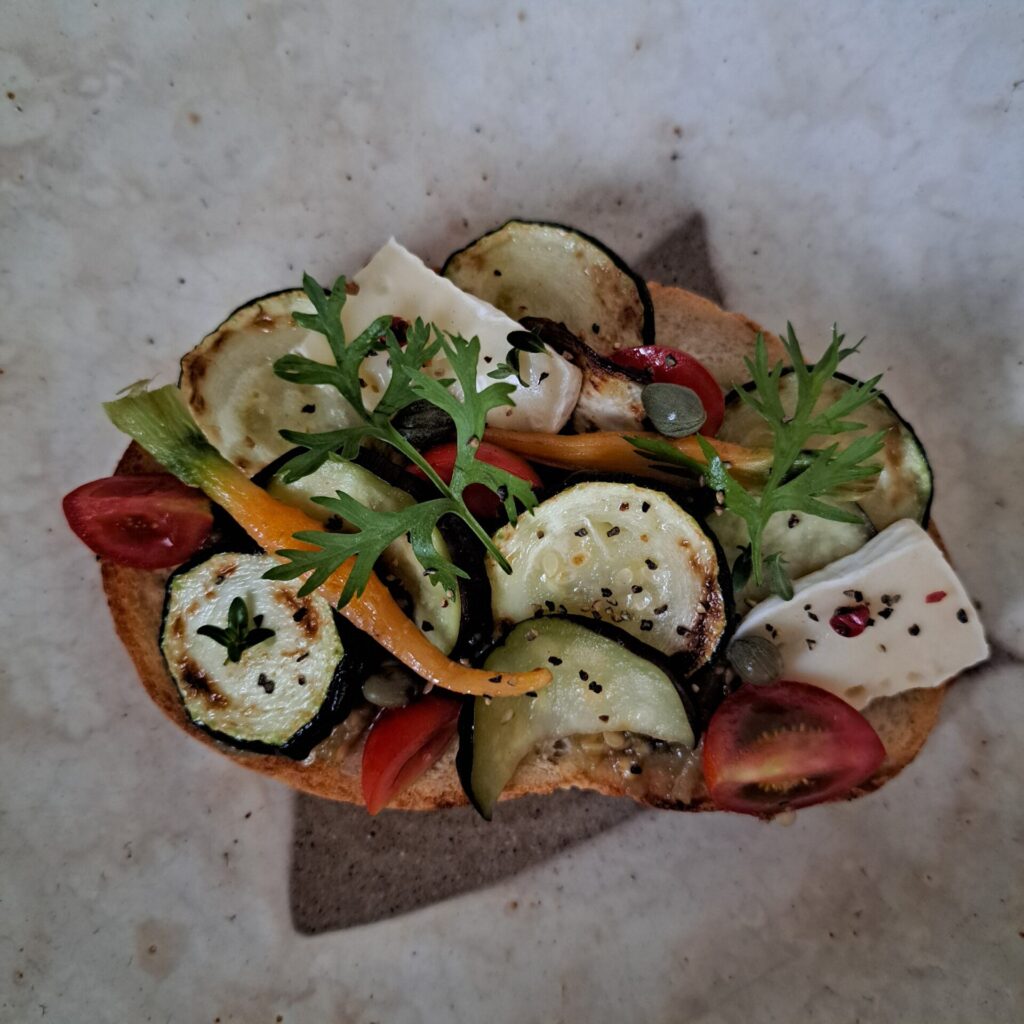 パン・ド・カンパーニュはこんがりと焼き、茄子のピューレ