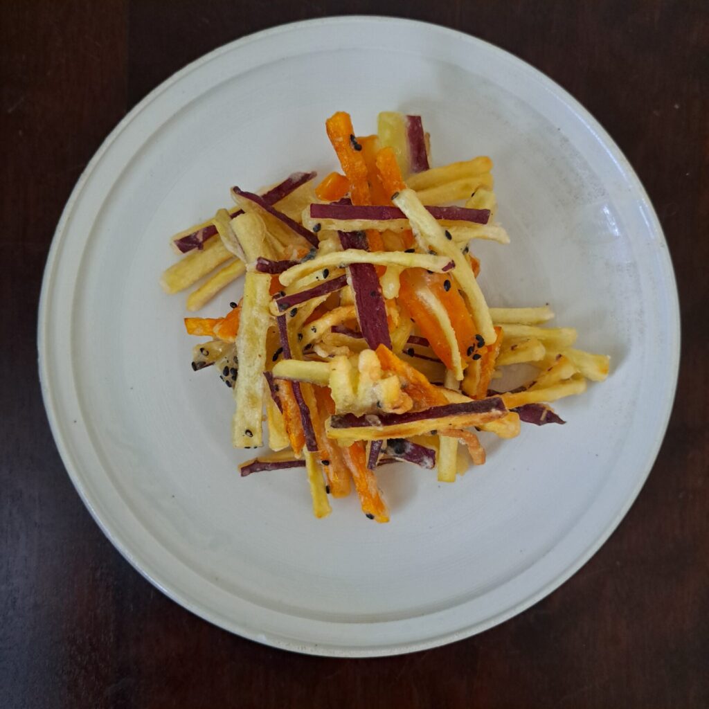 さつまいもを拍子木切りにし、水にさらしてざるに上げ、よく水気をきっておく。