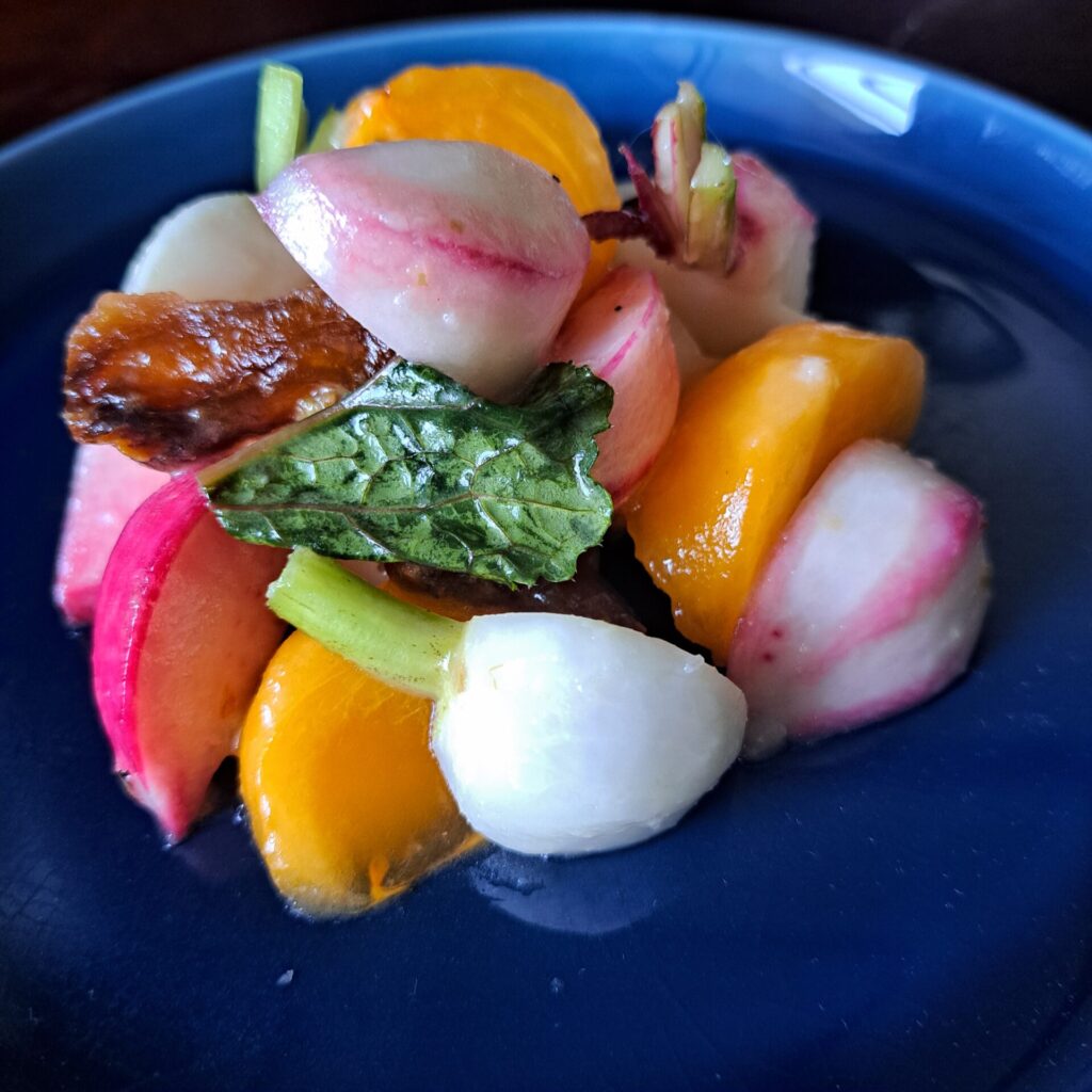 名残惜しい気持ちを込めて[小蕪と柿・干し柿のマリネ]です。